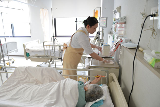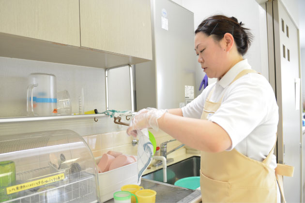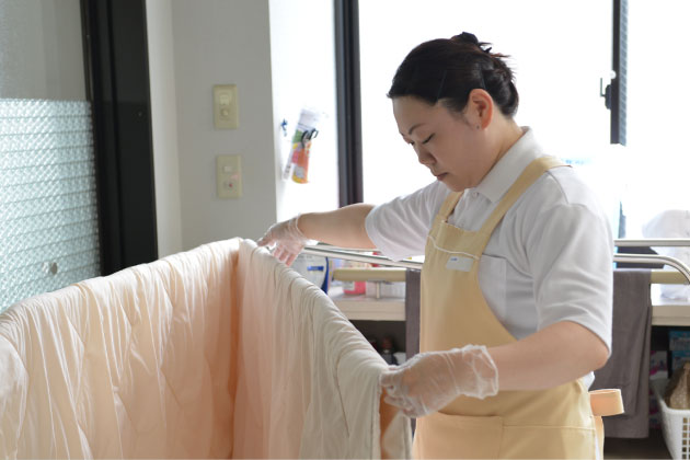 患者様のエプロン、コップの洗浄、詰所、病棟の清掃、環境整備など、直接患者様に関わらない業務ですが、特に清掃は念を入れ、肌荒れ、咳、アレルギーの予防ともなり、仙齢会の基本理念の安全で質の高い医療に貢献しています。
