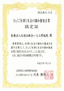 いなみ野病院は公益財団法人兵庫県勤労福祉協会より「ひょうご仕事と生活の調和推進企業」としてから認定されました。