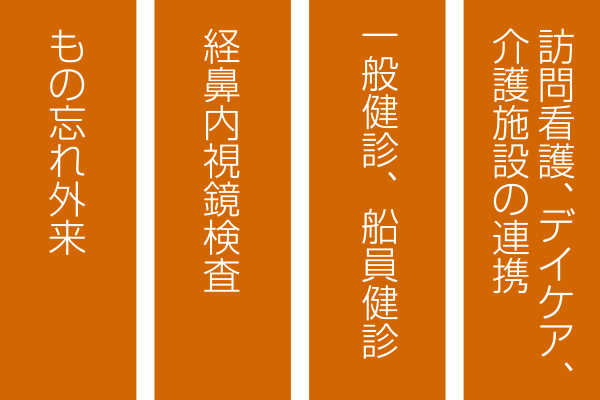 当クリニックでは内視鏡設備も整っており、消化器疾患、生活習慣病(高血圧症、糖尿病、高脂血症など)内科全般の診療を行っています。消化器疾患については胃カメラ、大腸カメラにも対応しています。特に胃カメラは経鼻のものを導入しており細径で苦痛が少なく負担の軽い検査となっています。胃・大腸内視鏡検査の年間症例数は292件、また、健康診断数(一般224件、特定健診281件、船員健診98件)、予防接種数(インフルエンザ1,267件、肺炎球菌113件、その他149件)の実績があります。